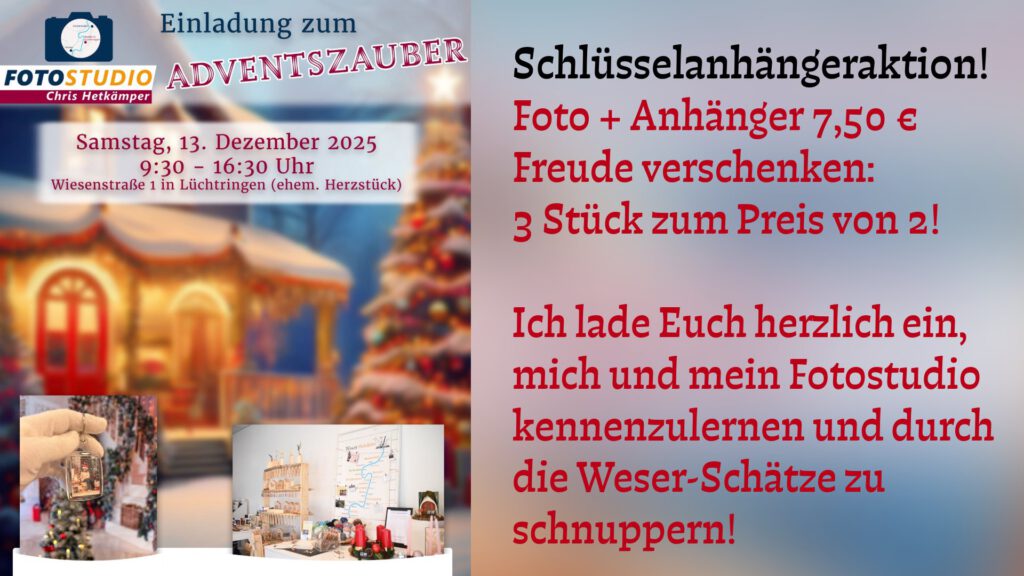 Lasst ein festliches Foto in meiner Weihnachtskulisse aufnehmen und erhaltet einen Schlüsselanhänger für 7,50 € – oder perfekt zum Verschenken: 3 Stück zum Preis von 2.